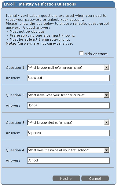 If you want to hide your input while you are typing, select the Hide answers option. This will hide your input with password characters and an additional confirmation text box will appear for each answer.